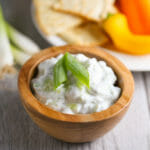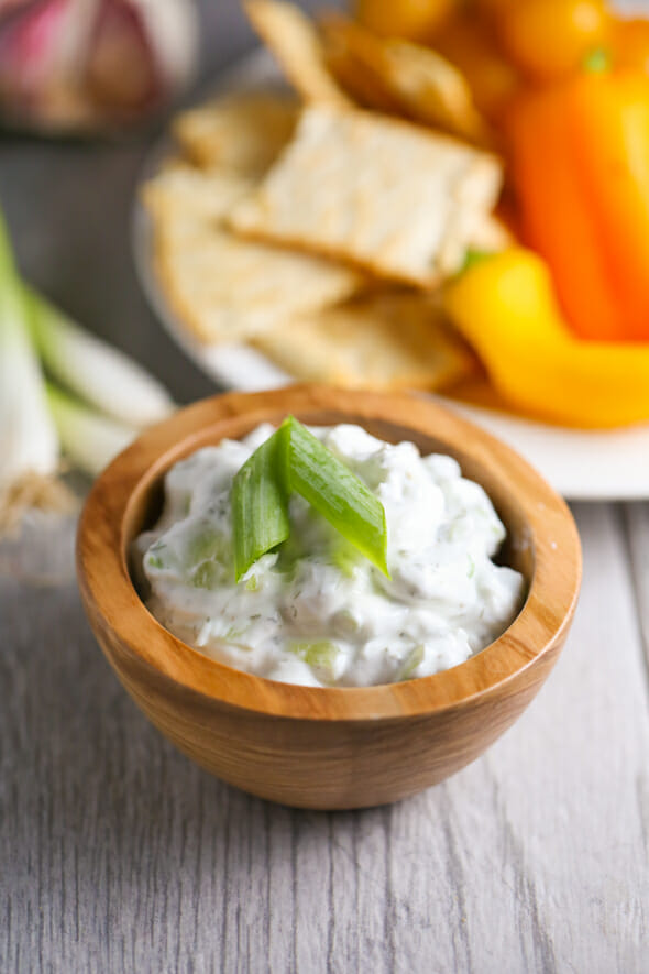 If you’re not familiar with tzatziki, it’s a creamy, cucumber-y, savory sauce that goes on top of a gyro (basically, a pita filled with Greek-seasoned lamb or chicken). But guess what? You can also dip vegetables, pita wedges, crackers, or flatbread in it. I had some of this on hand a little while back and made a roasted vegetable pizza and dipped the pizza in it and it was awesome. You could even use it as a salad dressing– it’s super versatile!