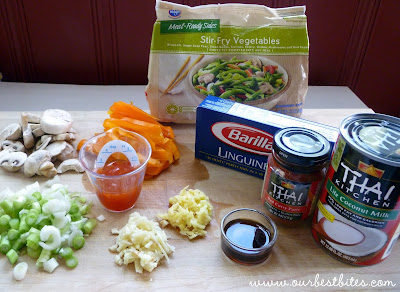 Linguine (be sure to buy the 16-oz. package and not the 12-oz. package), green onions, fresh ginger, fresh garlic, mushrooms, frozen (gasp!) veggies, red bell peppers, curry paste, and coconut milk. I sometimes get a little bewildered at the grocery store when recipes call for curry paste–what kind of curry? Indian? Thai? Green? Red? Powder? Paste? Sauce? Yeah, you get the picture. In this recipe, I used Thai Kitchen red curry paste, although you could totally use their green curry paste, too. It’s inexpensive and super easy to find. Problem solved, right?