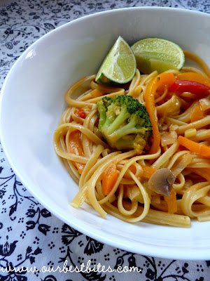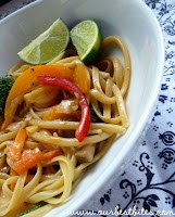 One of the saddest parts for me of moving to Louisiana was leaving behind all my favorite restaurants and foods I’d come to love. One of my favorite places was Noodles & Company. I’m sure you guys are the same as me–there are times in my life that I look back at with such fondness and such happy memories that it almost hurts. The summer of 2006 was that way for me and it seems like in my memories, I was always at Noodles & Company–with my sister before she moved to Alabama, with my then-two-year-old son on a rainy, rainy day after story time at the library, the night I found out I was pregnant with my daughter (and, subsequently, 9 months later on the night before I had her). My favorite thing to eat there (besides the Macaroni and Cheese which had about a million calories and as many grams of fat, so I’d order a small portion for my son and snack off his plate) was the Bangkok Curry. It was light, healthy, full of veggies, and unbelievably delicious. At the restaurant, there’s the option of adding grilled chicken or shrimp, but I always just went the vegetarian route.